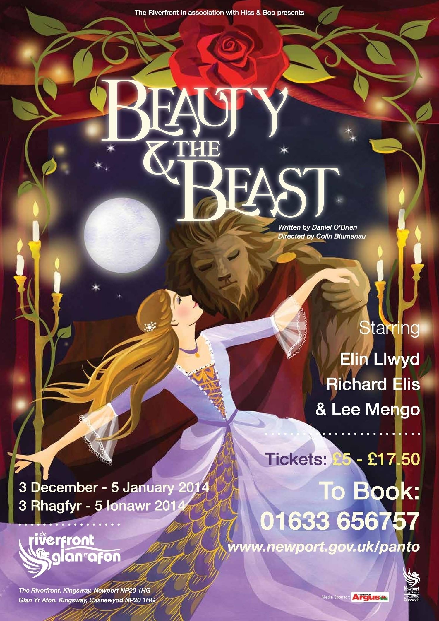 Beauty and the Beast Based on the story of Beauty and the Beast. Production company: Hiss and Boo The Riverfront, Newport 03 December 2013 to 05 January 2014 Ticket prices: £5.00 to £17.50 Production web site Poster Publicity Beauty and the Beast People